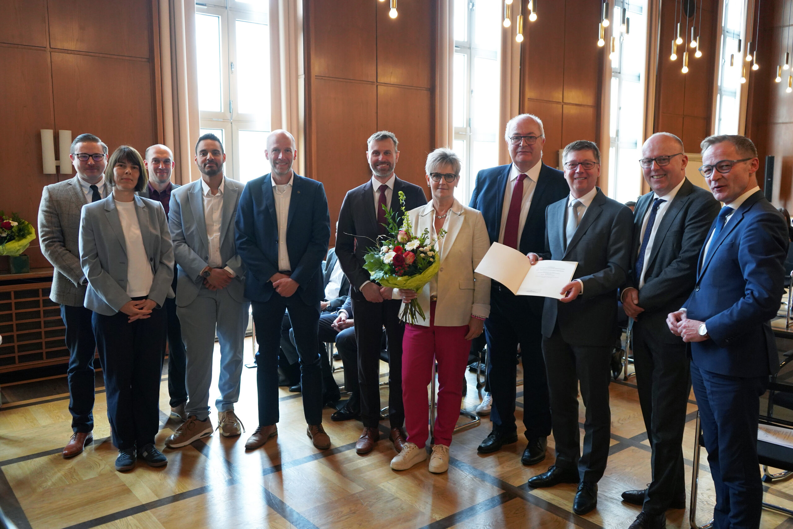 v.l.: Sebastian Tietz, kdvz; Dr. Hanna Sommer, Deutscher Städtetag; Philip Gyamfi-Poku, Hendrik Wächter und Boris van Benthem, Stadt Oberhausen; Kerstin Pliquett, KDN; Thomas Hunsteger-Petermann, Ministerium für Heimat, Kommunales, Bau und Digitalisierung des Landes Nordrhein-Westfalen; Michael Jehn, Stadt Oberhausen; Manfred vom Sondern, gkd-el; Daniel Sieveke, Ministerium für Heimat, Kommunales, Bau und Digitalisierung des Landes Nordrhein-Westfalen.